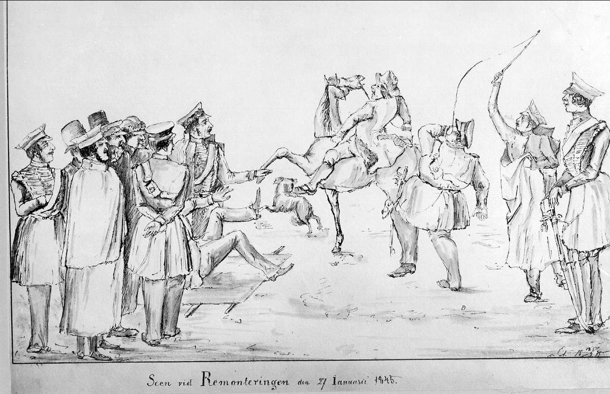 John Arsenius, född 1818. Officer vid K 3 1838-1868. Känd konstnär, framför allt hästmålningar. Söner: Georg -- Konstnär. Sam -- Officer, fältjägare. Scen vid Remonteringen den 27 Januari 1845