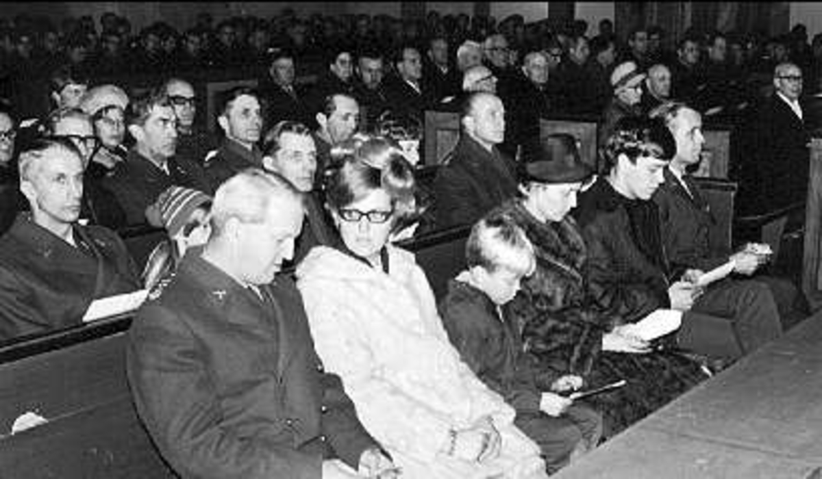 Regementets dag. S:t Helena kyrka i Skövde. Omkring 1963. Främre raden: Måns K. Alexandersson, Gullan Alexandersson, Birgitta och N-G Malmström med två av sina barn. Andra raden: Magnus Fornell, Stig Aaby-Ericsson, Jan Widegren.