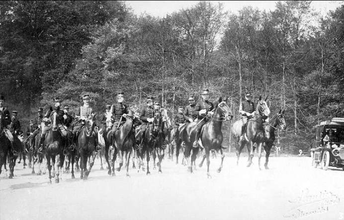Husarer på resa och kommendering. Jaktritt utanför Bryssel 1909.