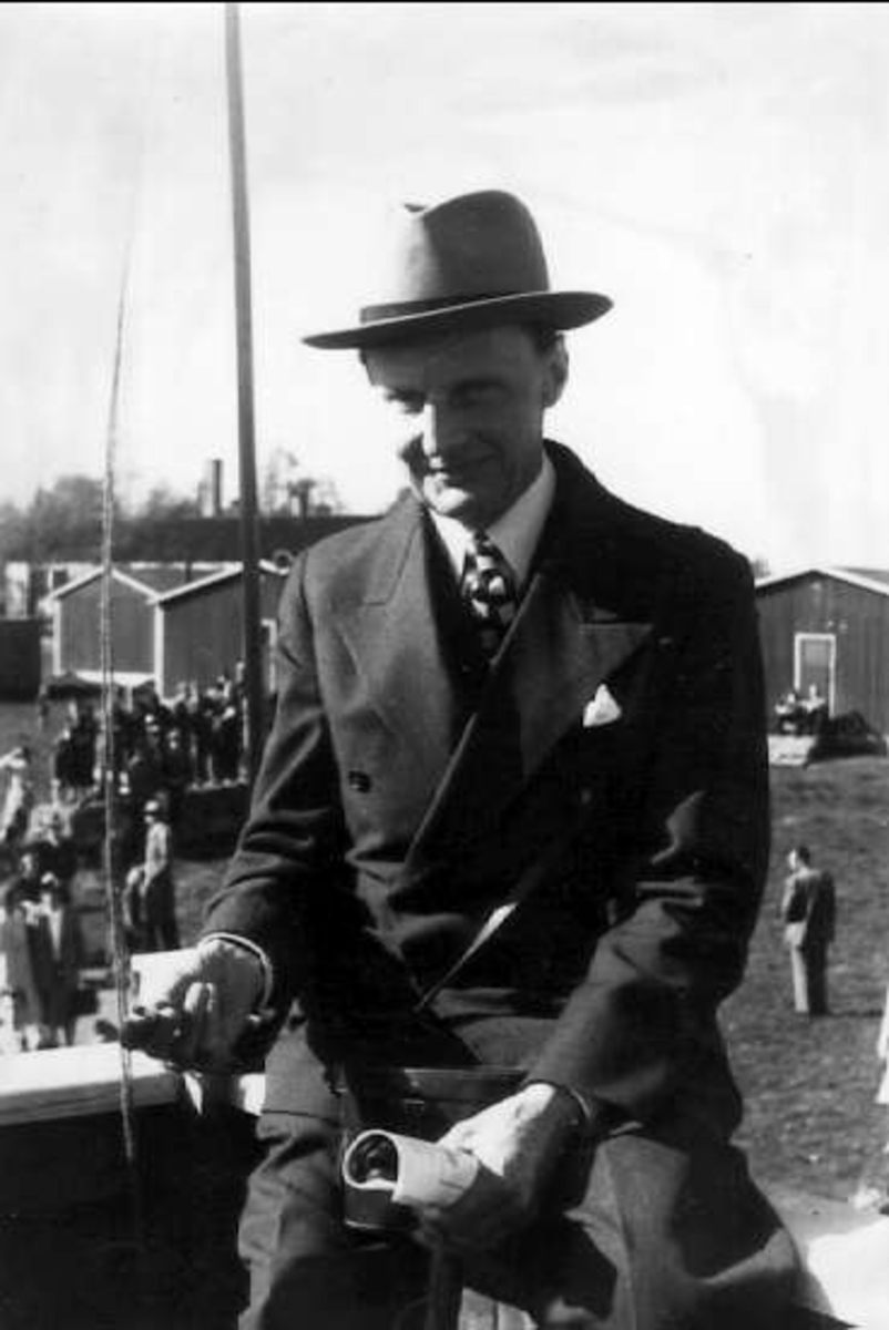 Pensionerade ryttmästaren Sven Torén K 2 på besök vid kapplöpningarna på K 3. Sven Torén var tidigare en duktig kapplöpnings - och fälttävlansryttare, utbildade bl a Santa Lucia xx , som med Stig Aaby-Ericsson i sadeln vann bl a S M i fälttävlan och arméfälttävlan.