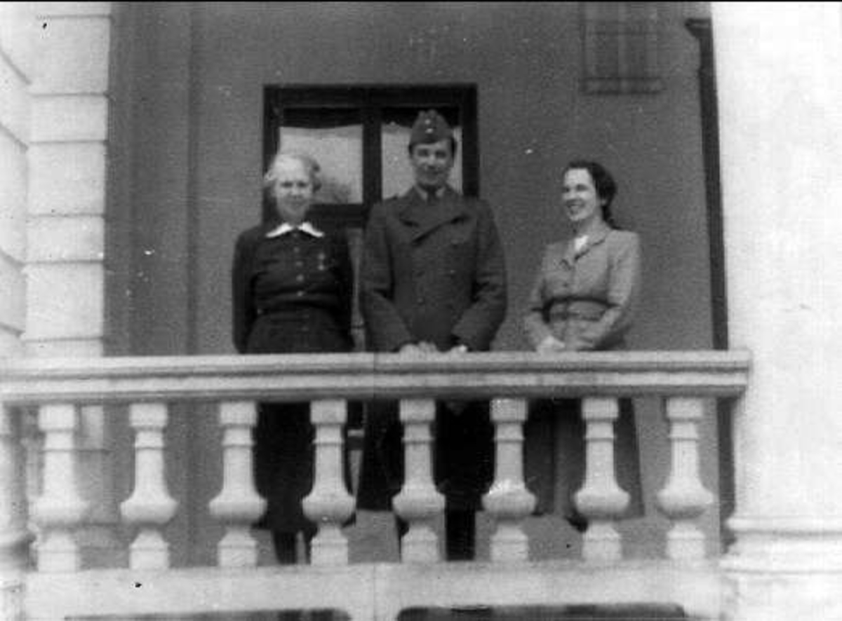 Troligen Vera Sager med "sällskapsdam" på Margreteholms balkong tillsammans med ryttm Rikard Montgomery-Cederhielm K 3.
