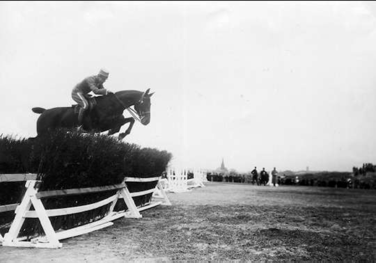 Titel: 1. årseleverna på Strömsholmskursen på tävlingsresa till Stockholms fältrittklubbs tävlingar på Gärdet i Stockholm. Strömsholm 1910-11.