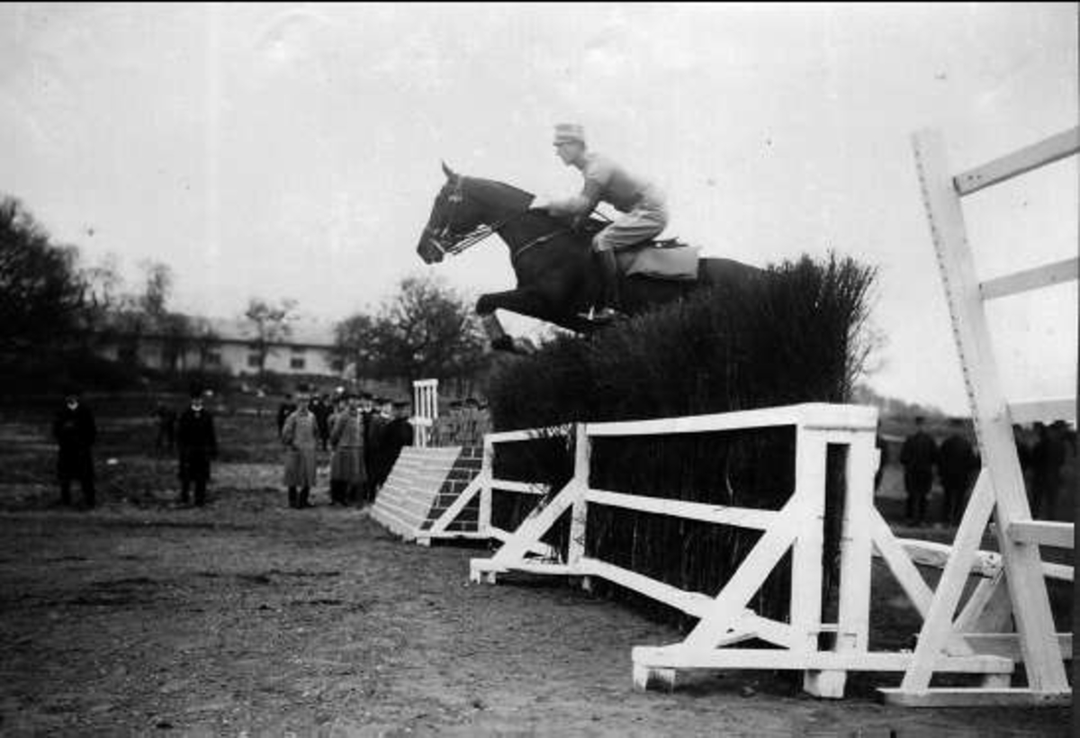 Titel: 1. årseleverna på Strömsholmskursen på tävlingsresa till Stockholms fältrittklubbs tävlingar på Gärdet i Stockholm. Strömsholm 1910-11.