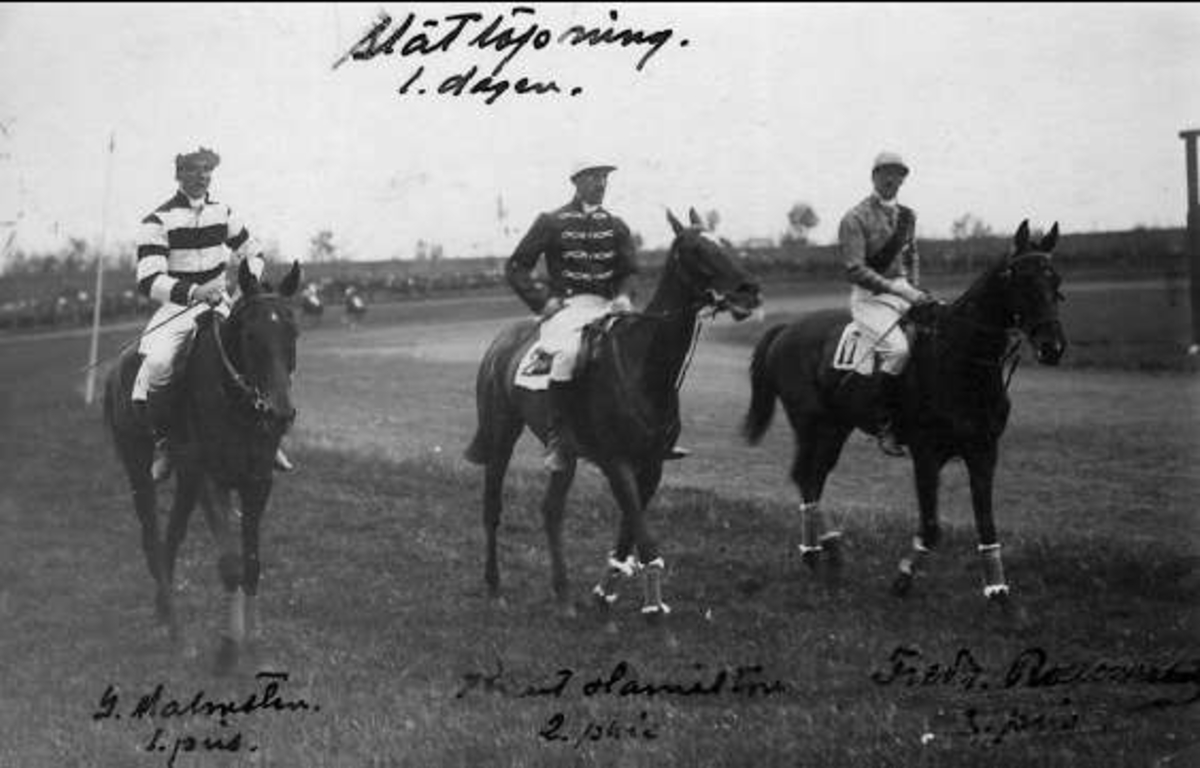 Strömsholm 1910-11. Slätlöpning 1. Tävlingsdagen i Malmö? Från vänster i bild: Underlöjtn Georg Malmsten K 6 - 1. pris, underlöjtn J Robert Hamilton K 3 - 2. pris, ryttm Fredrik Rosencrantz K 6 - 3. pris.