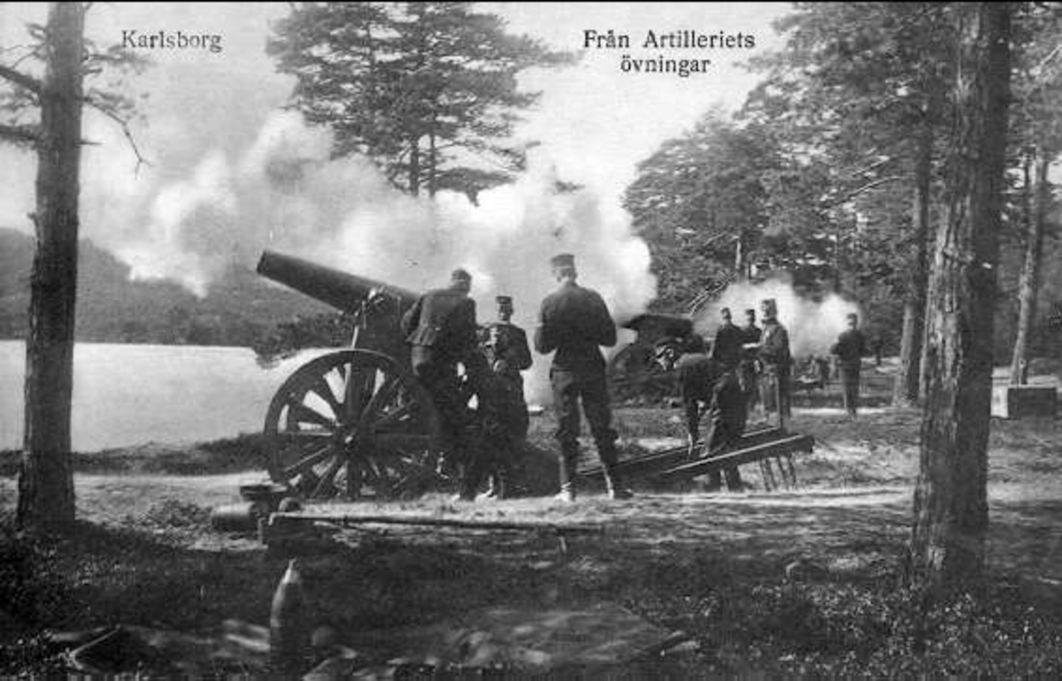 Karlsborg, artilleriets övningar med 16 cm haubits m/1885 från Strandvägen omkr. 1900.
