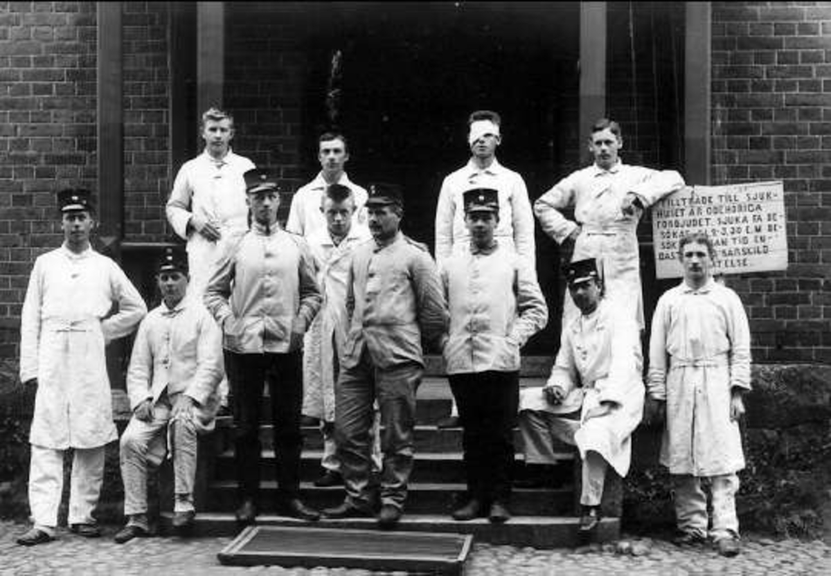 Sjukvårdspersonal, patienter och militärer på trappan till ett av annexen på Garnisonssjukhuset, Karlsborgs fästning.