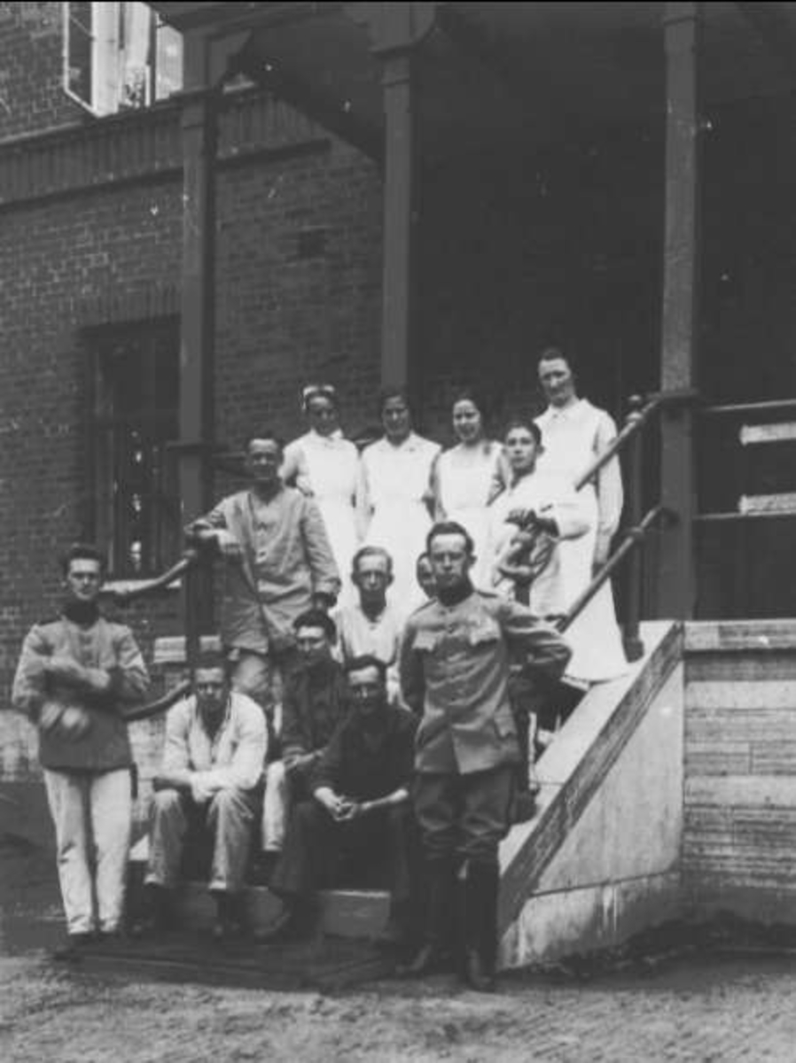 Titel: Sjukvårdspersonal, patienter och militärer på trappan till ett av annexen på Garnisonssjukhuset, Karlsborgs fästning.