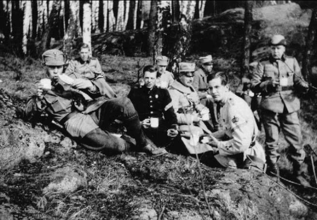 Militärer i fält iklädda uniform m/ä, kaffepaus.