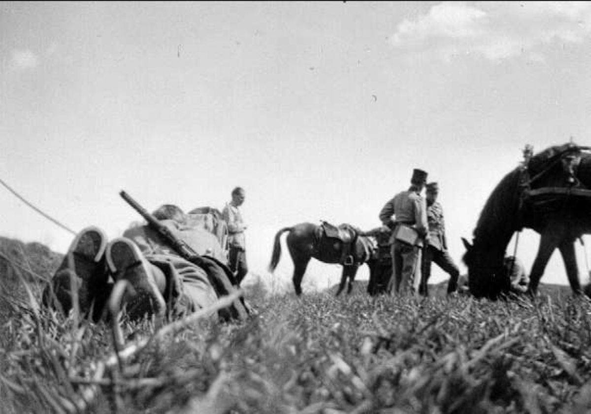 Militärer i fält med hästar