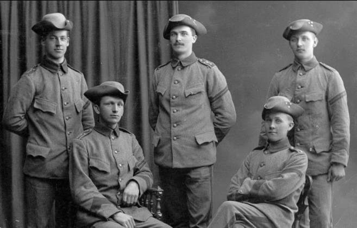 Gruppfoto, militärer med Landstormsuniformer. Fotot är taget i Boden.