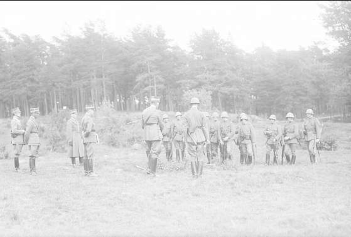Inspektion i terrängtjänst av kavalleriinspektören general G Gyllenstierna. Befälspersoner från vänster (i bild) : löjtn. Stig Roempke, K 3, ryttm. Harald Strömfelt, K 3, överstelöjtn. Henry Peyron, K 3, överstelöjtn. Åke Hök, stabschef, kavalleriinspektionen, general G Gyllenstierna, kavalleriinspektör.