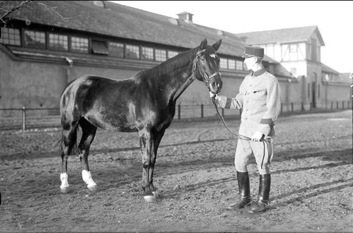 Livhusar i uniform m/1910 med stamhäst, öster om skvadronstallet