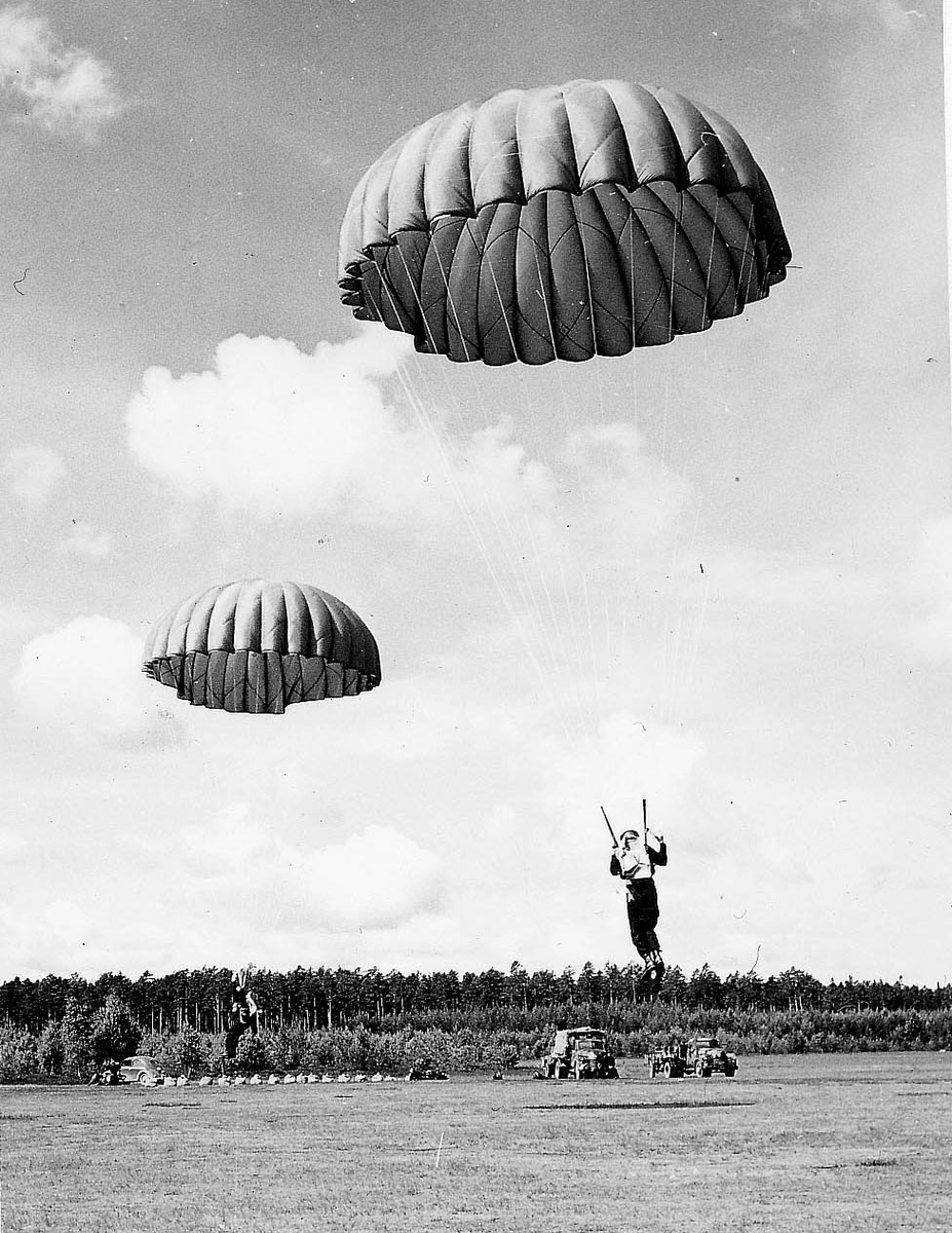 Fallskärmsjägarskolan i Karlsborg 1956.Landning på Flugebyn.