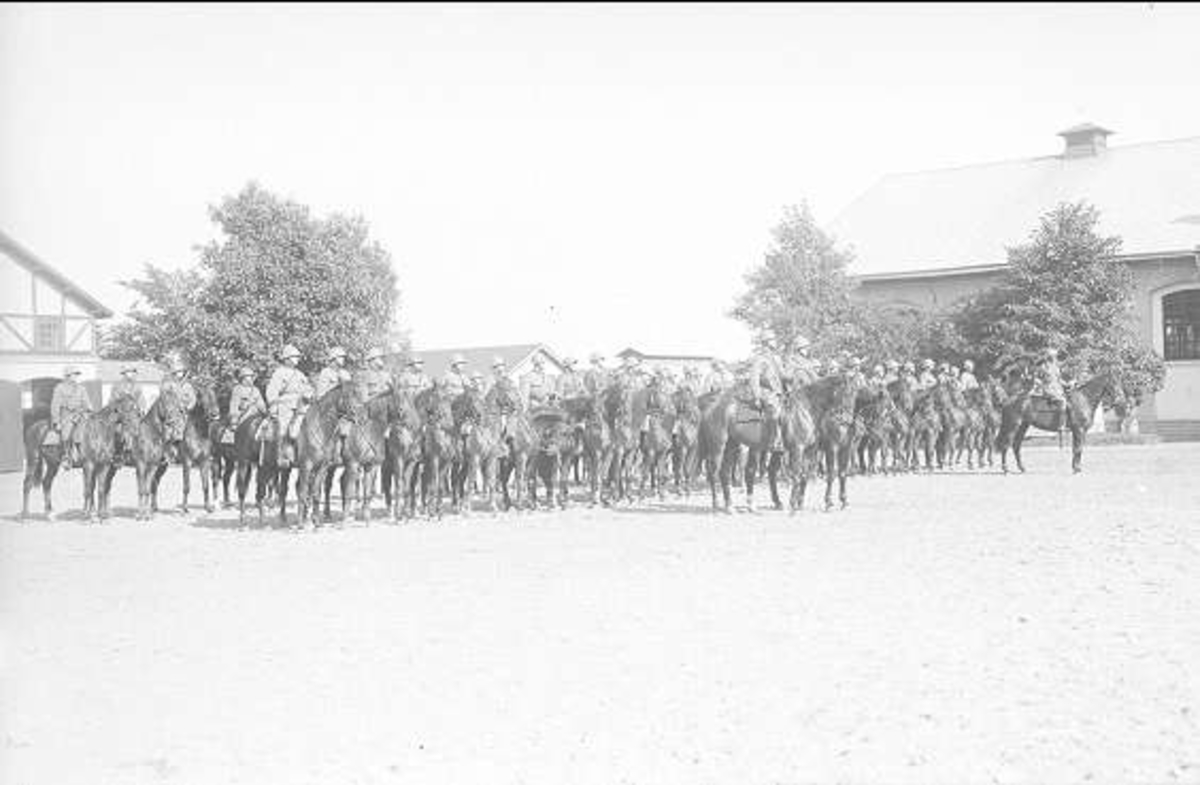 Tropp ur 4. skvadron uppställd på kaserngården söder skvadronens stall. I bakgrunden ridhuset.