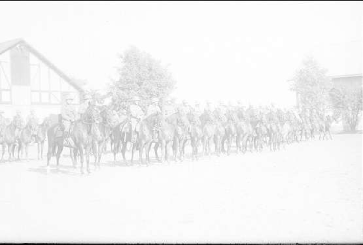 Tropp ur 4. skvadron uppställd på kaserngården söder skvadronens stall. I bakgrunden ridhuset.