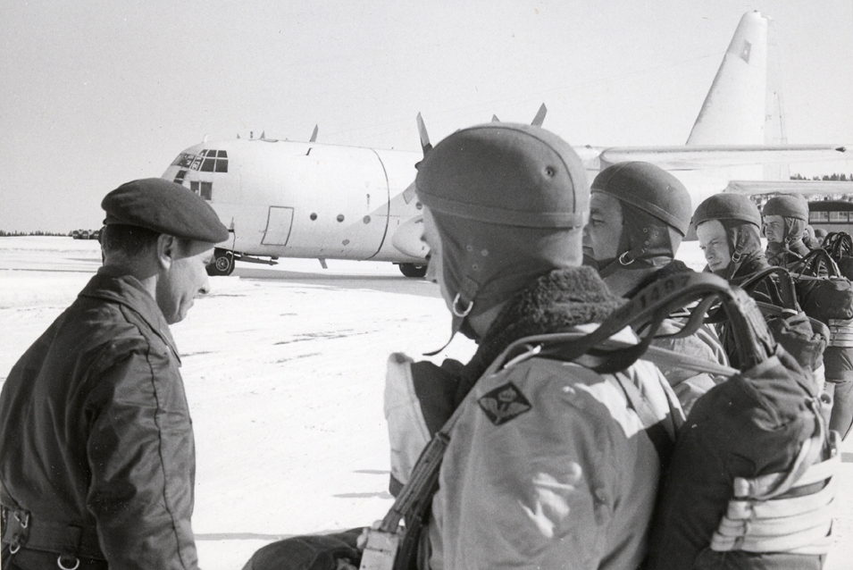 Fallskärmsjägarskolan i Karlsborg 1956. Vinterhopp uppställning.