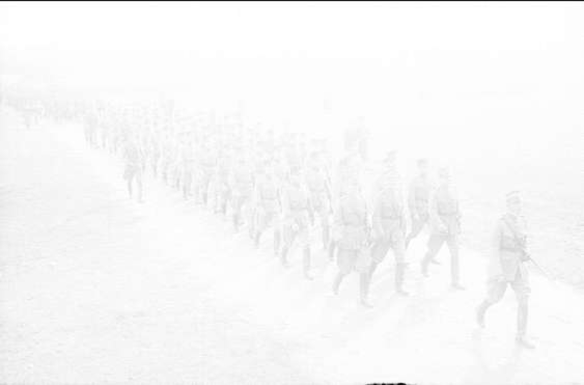 På marsch från kasern till fältgudstjänst i Dunkehall. Obs! Uniform m/10 och mössa m/ä.