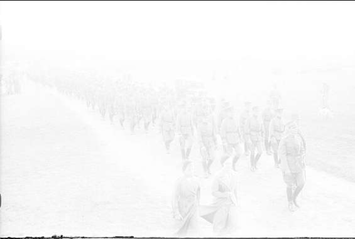 På marsch från kasern till fältgudstjänst i Dunkehall. Obs! Uniform m/10 och mössa m/ ä.