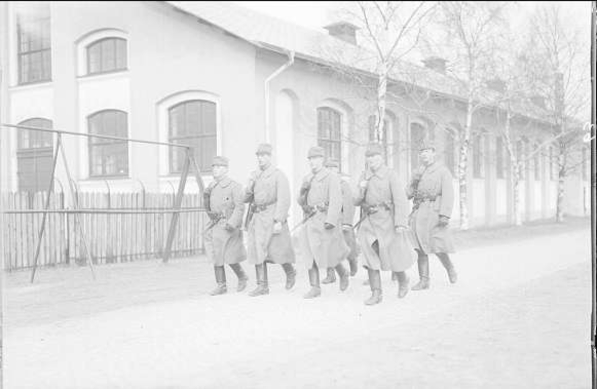 Utbildning, exercis, på stensatta ridvägen mellan ridhusgrinden och övningsfältet. Närmast ridhusets södra gavel.