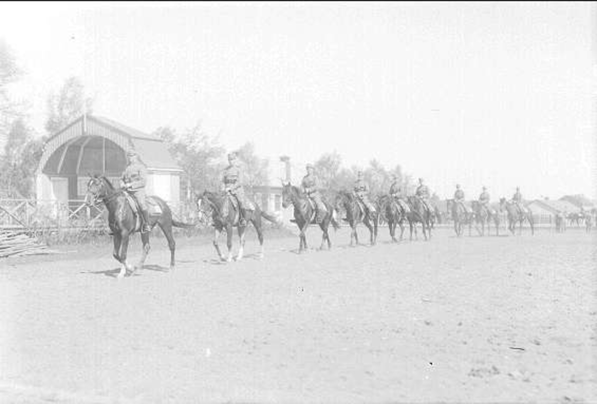 Antagligen en aspirantskola under inspektion i ridning på sandbanan öster om ridhuset. Uniform m/23. Obs! I bakgrunden till vänster musikpaviljongen.