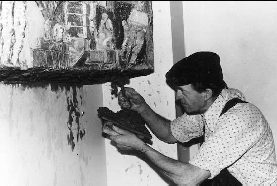 Carl Harry Stålhane under arbete med relief i smält urberg kallad "De som byggde fästningen". Finns vid staben i slutvärnet.