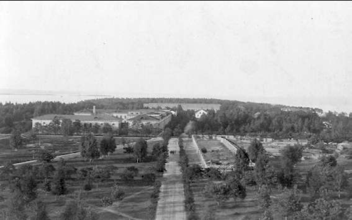 Fästningen. Utsikt från kyrktornet över Kommendantsgatan. Till vänster syns tyghuset (tygstation). Även nuvarande serviceförrådet under uppbyggnad.