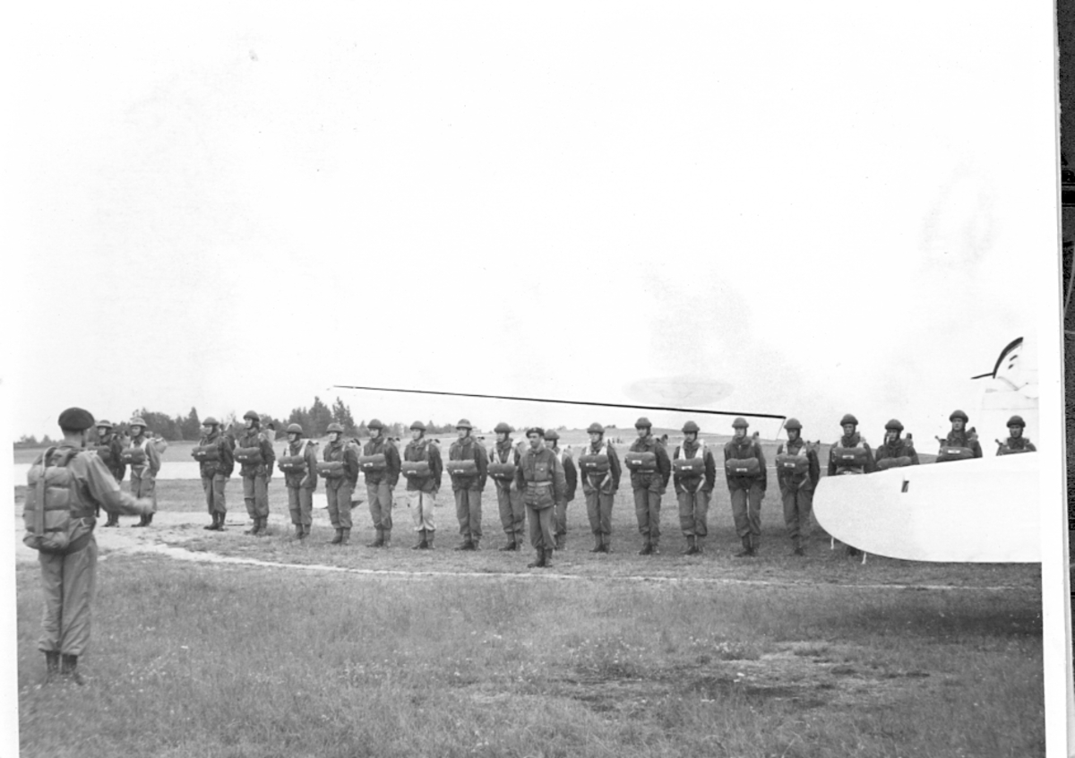 Fallskärmsjägarskolan i Karlsborg början 1950-tal. Bilden monterad på papp.