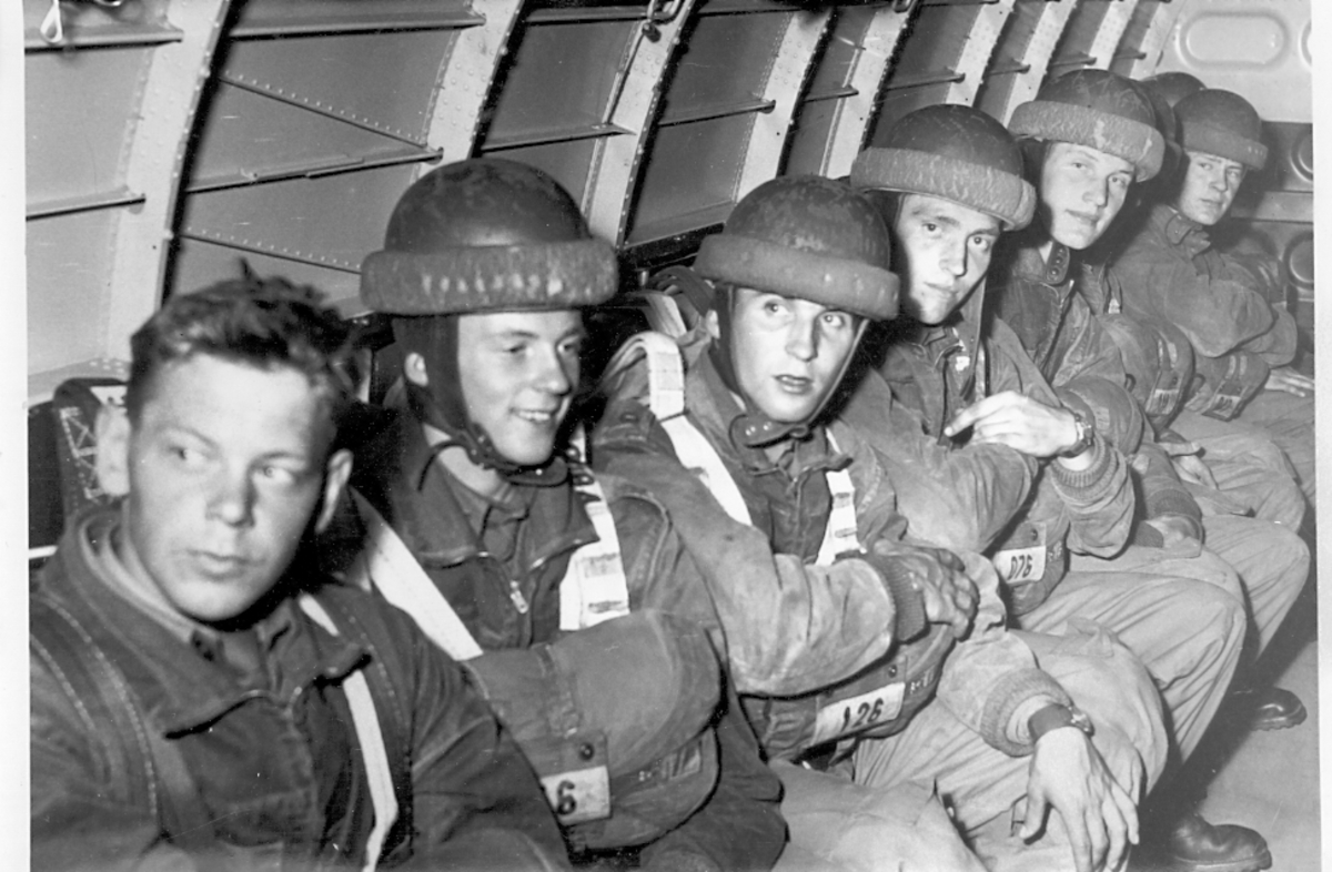 Fallskärmsjägarskolan i Karlsborg början 1950-tal. Bilden monterad på papp.