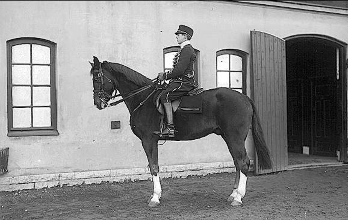 Livhusar, troligen från en skvadrons volontärskola, fotograferad till häst framför skvadronens stall.