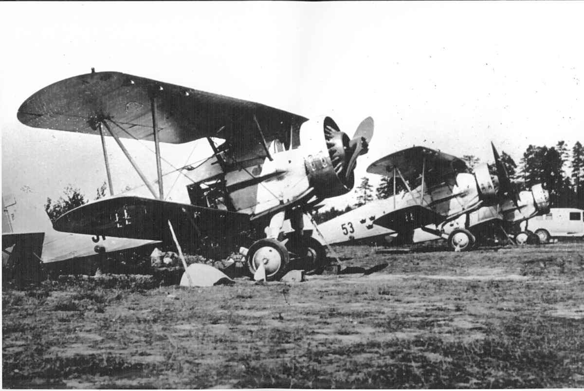 F6 i Karlsborg 1936.Lätta bombplan typ B 4 AQ (Hawker Hart) ur 1:a flygkåren F1 på flygfältet.OBS De runda barlastvikterna av bly vid siffrorna.
