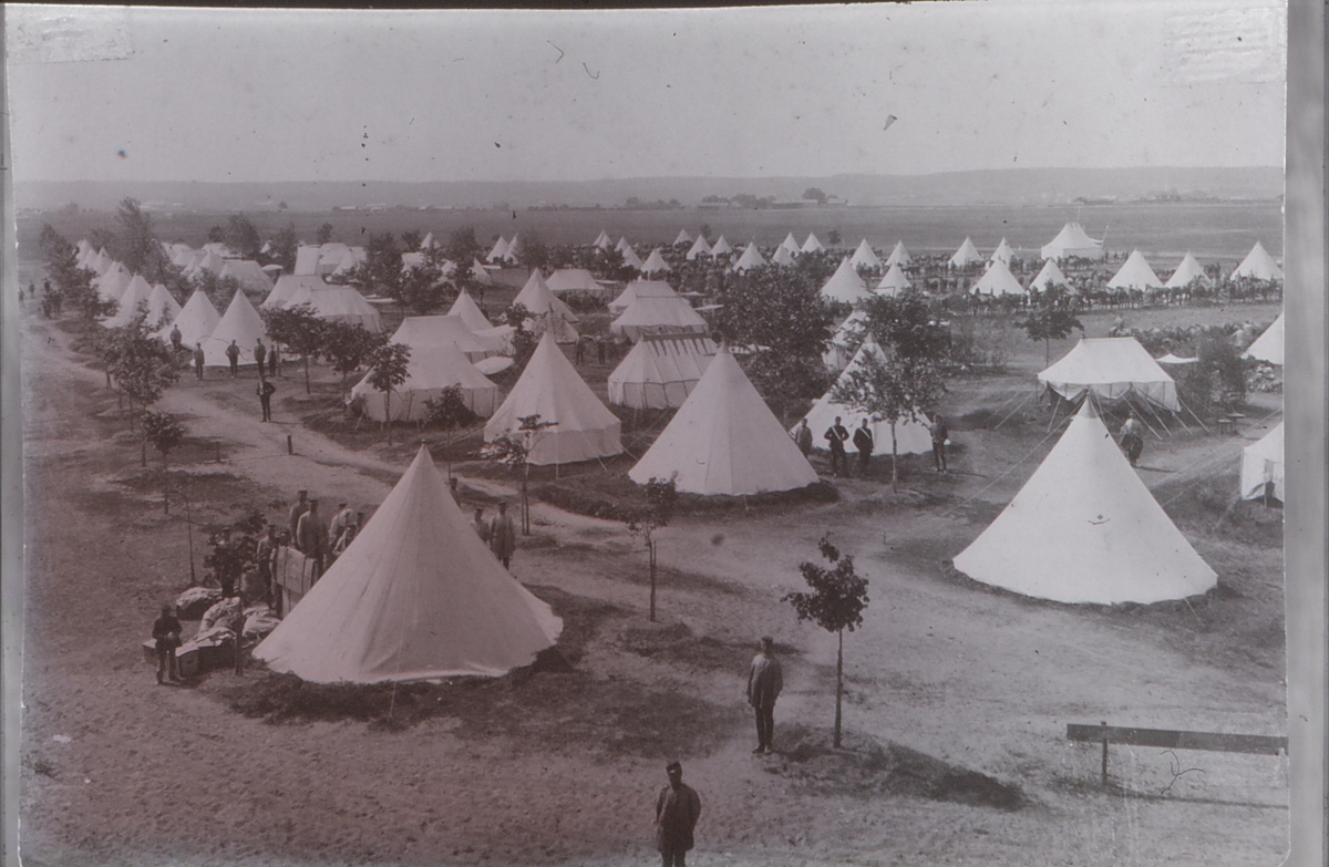 Livregementets husarer. Husarlägret på Sanna hed från nordväst med Norrby i bakgrunden.1870-talet.