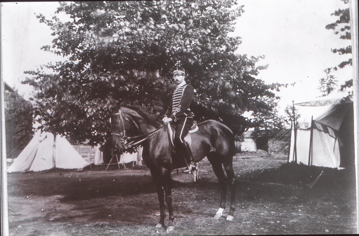 Livregementets husarer. Husarlägret på Sanna hed omkring 1900.Prins Eugen till häst som tjänstgörande skvadronchef. I bakgrunden officersstallarna.