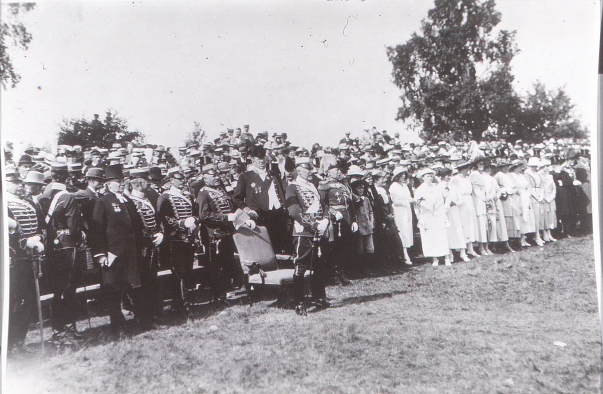 Livregementets husarer. Husarlägret på Sanna hed. Vid avtäckning av minnesstenen spelades regementets marsch varefter prins Eugen avtäckte stenen.