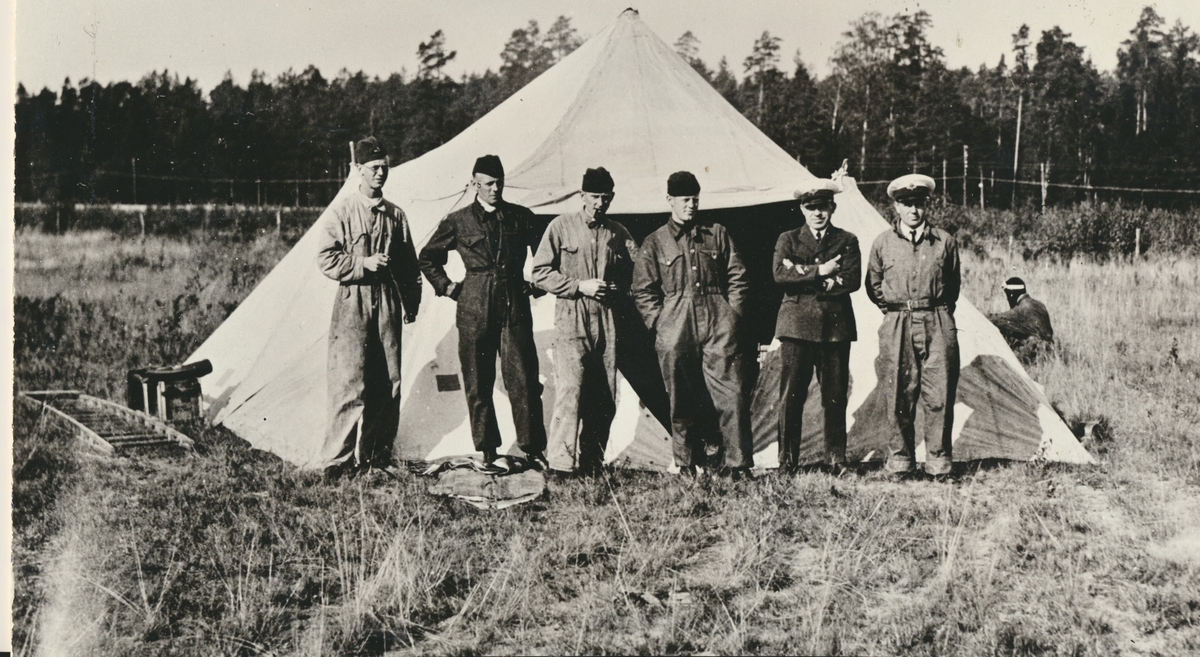 Flyget i Karlsborg före F6. Fältförläggning på 30-talet. Längst th: Palmqvist, Holmberg.