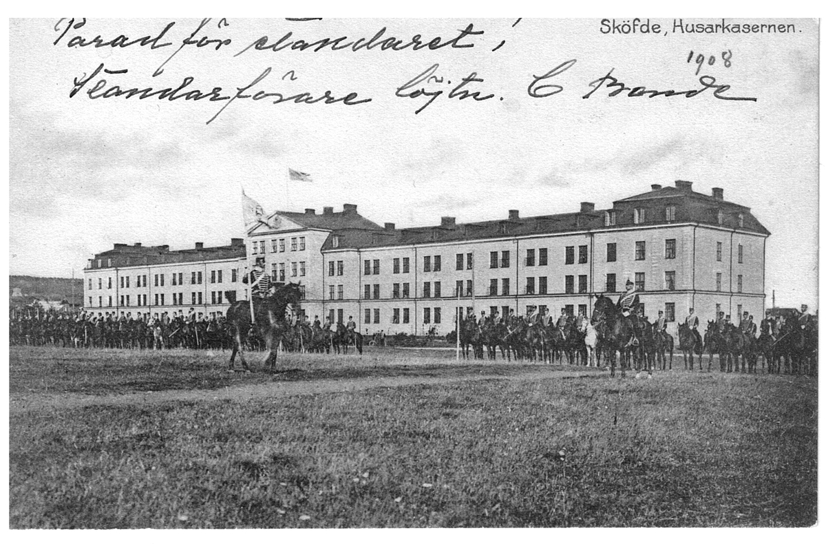 Livregementets husarer, K3 i Skövde 1908.Standarförare: Löjtnant C Bonde.