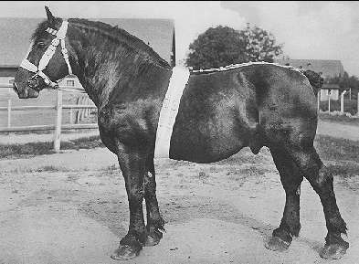 Ardenner imp, brun. Mankhöjd 159 cm. Fader Paulin De Salles. Moder La Bourgeoise. Ägare Bjertorps egendom. Stora Hof. Västergötland. Född 1904 Prem A.B.