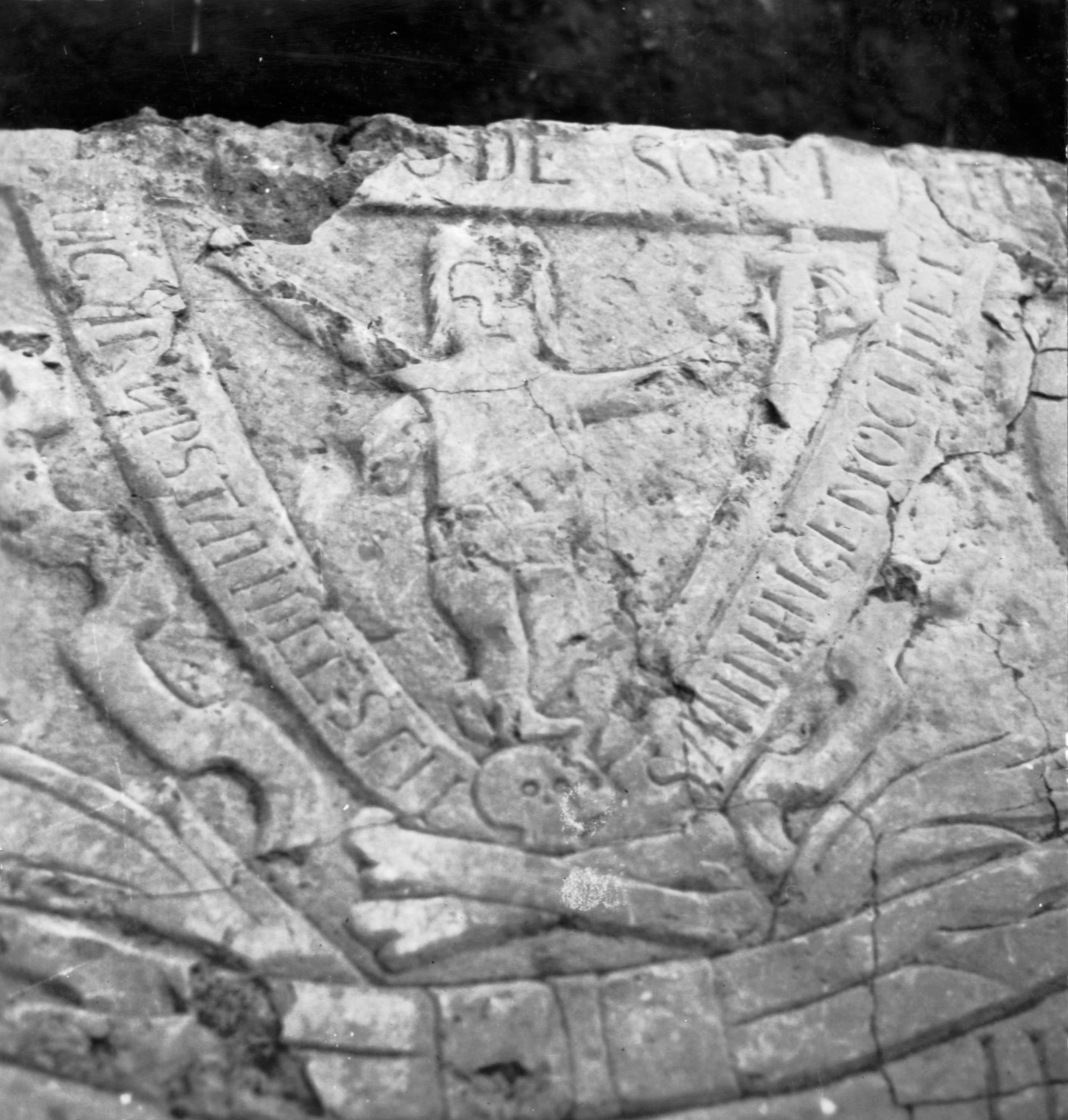 Gravhällen, klockfigurens krona med Kristusgestalten. Foto åt väster.