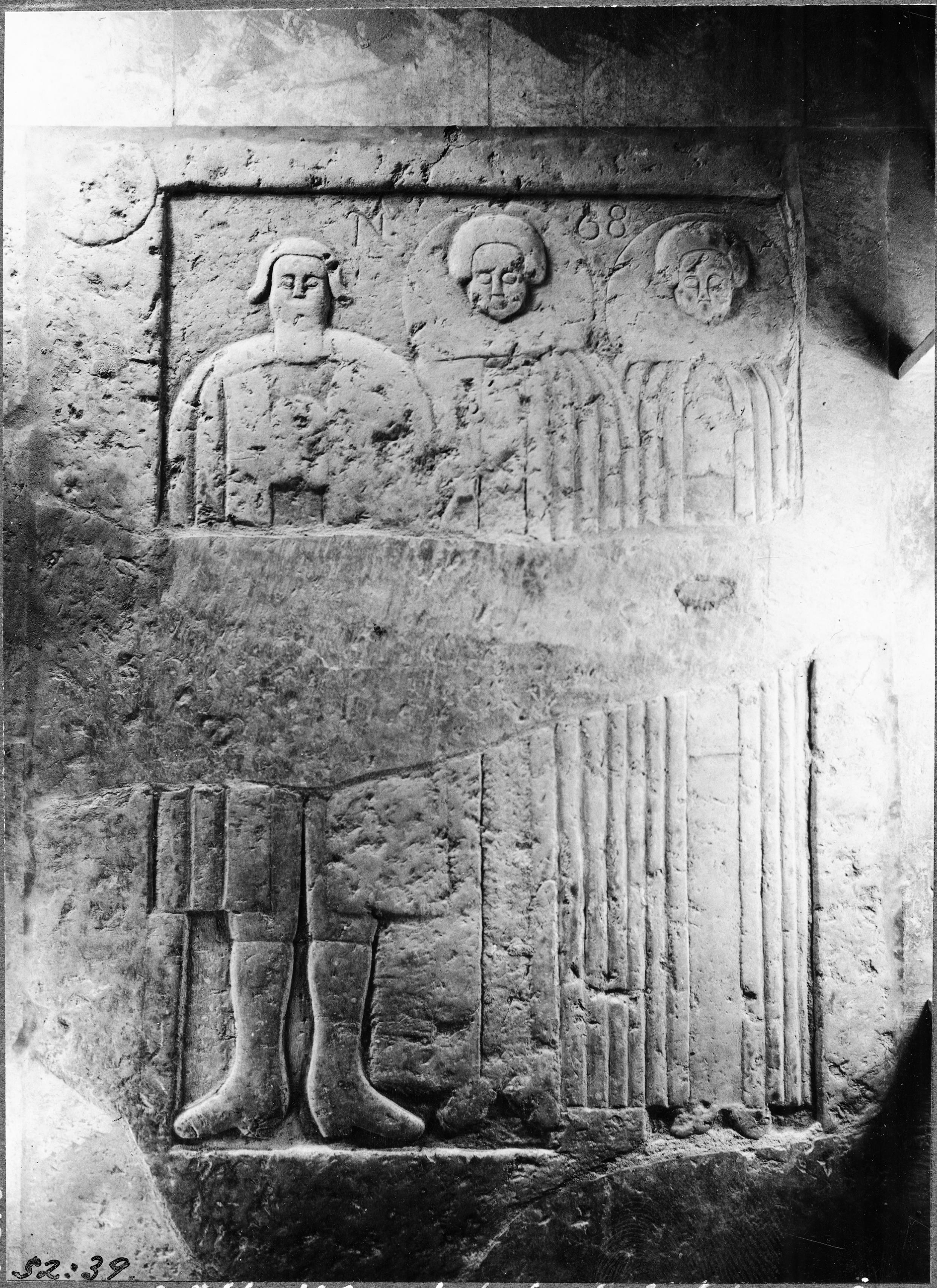 Gravhäll, i två delar, tre helfigurer, 1600-talet.