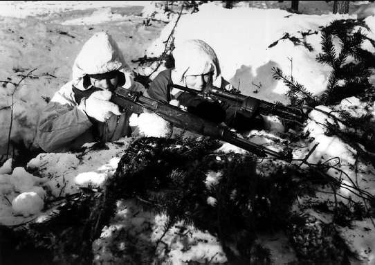 Jägare i vinterutrustning med automatgevär (till vänster i bild) och kulsprutepistol (till höger i bild).