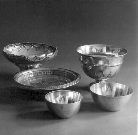 5 st silverskålar erhållna som hederspriser vid olika ryttartävlingar, därefter skänkta till officerskårens samlingar av respektive segrare.