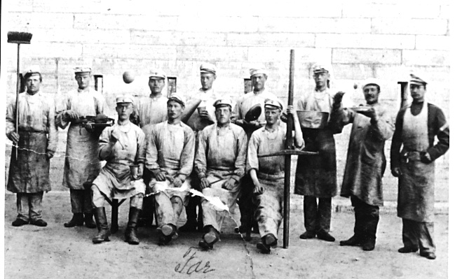 Karlsborg. Sappör-bataljon, 3:dje kompani under kökskommendering (fotot taget innanför köksvalvet). 1880-talet.