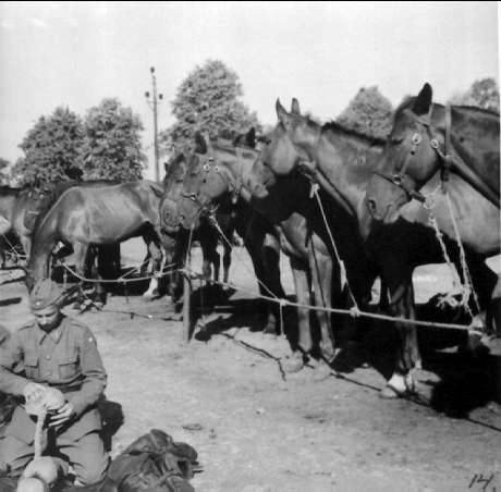 Hästar bundna vid krubblina i Bivacken (troligen vid Örlen). "Hästposten" (i uniform m/39) synes mera intresserad av något i mattornistern än att övervaka hästarna.