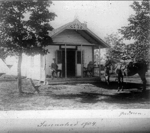Officer på verandan till sin officersstuga. Hästskötare har lett fram tjänstehästen.