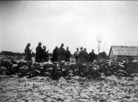 Fälttjänstövningar i Västergötland 1912 med 4. Skv K 7 i Malmö, skvadronchef löjtnant Ragnar Aaby- Ericsson. Vita band runt uniformsmössa markerar att skvadronen tillhör fiendesidan.