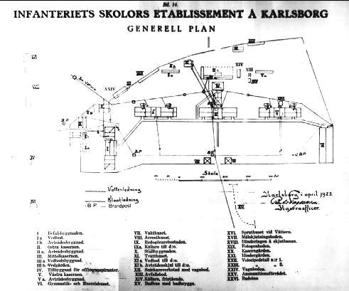 Infanterivolontärskolan, senare rekrytskolan för infanteriets off- och reservoff. Aspiranter, 1878 - 1927. Planskiss över infanteriets skolors etablissement, Karlsborg.