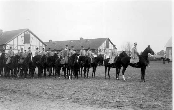 En del av 2 skv framför stallet, Sven Littorin på Emir längst till höger i ledet bakom skvadronschef och skvadronsadjutant.