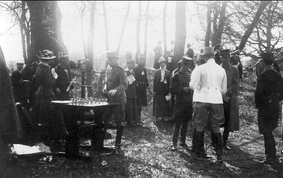 Ridskolan Strömsholm. Strömsholmskursen 1916 med flera. Vid hubertusjaktens "halali".
