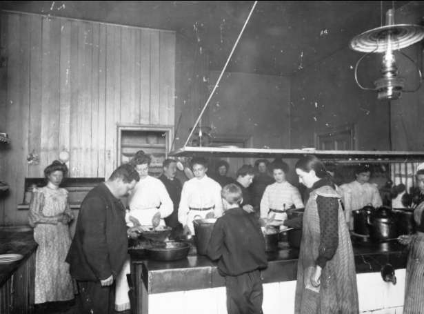 Fästningen. Interiör köket garnisonshotellet, till vänster syns källarmästare Nicander i gamla köket på off mässen. Nicander drev också "Öltappen" med ölutkörare.