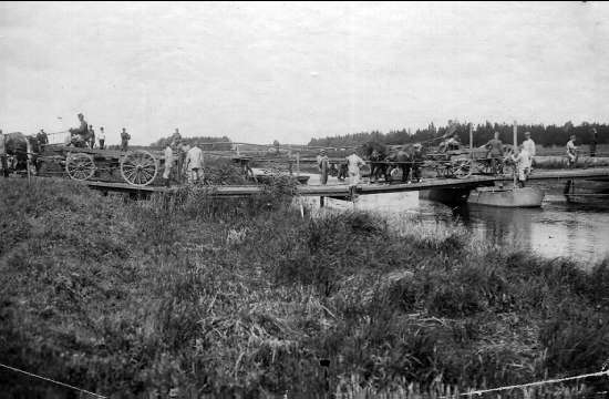 Broslagning. Göta ingenjörkår, omkr 1914, bro av krigsbromateriel m/1875. Neg. finns. Förstoring 22 x 32 cm.