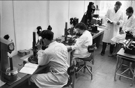 Interiör från ammunitionsfabriken (Vanäsverken), kemiska avdelningen 1950-talet, tvåa från vänster Hillevi Eriksson.